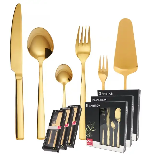 AMBITION PRATO Sztućce Komplet 72+21 el dla 18 osób / pudełko / złote