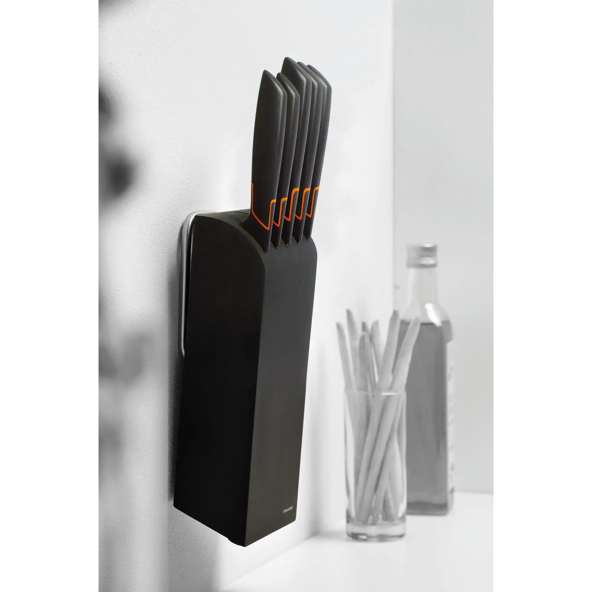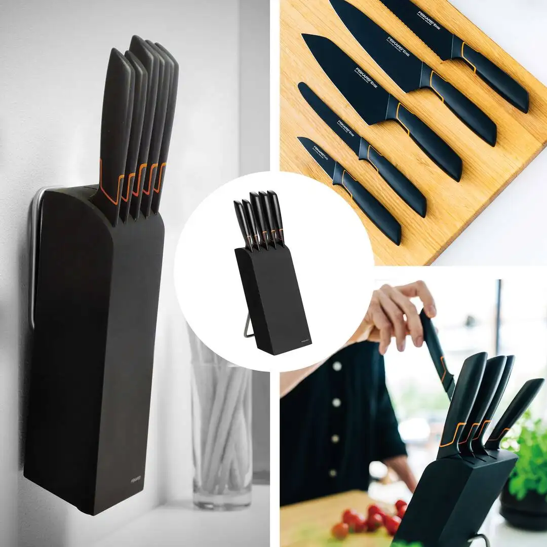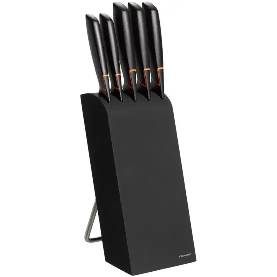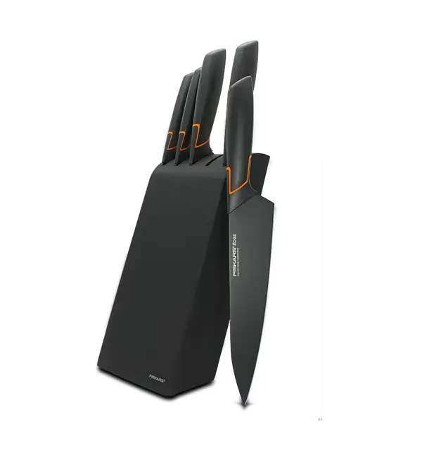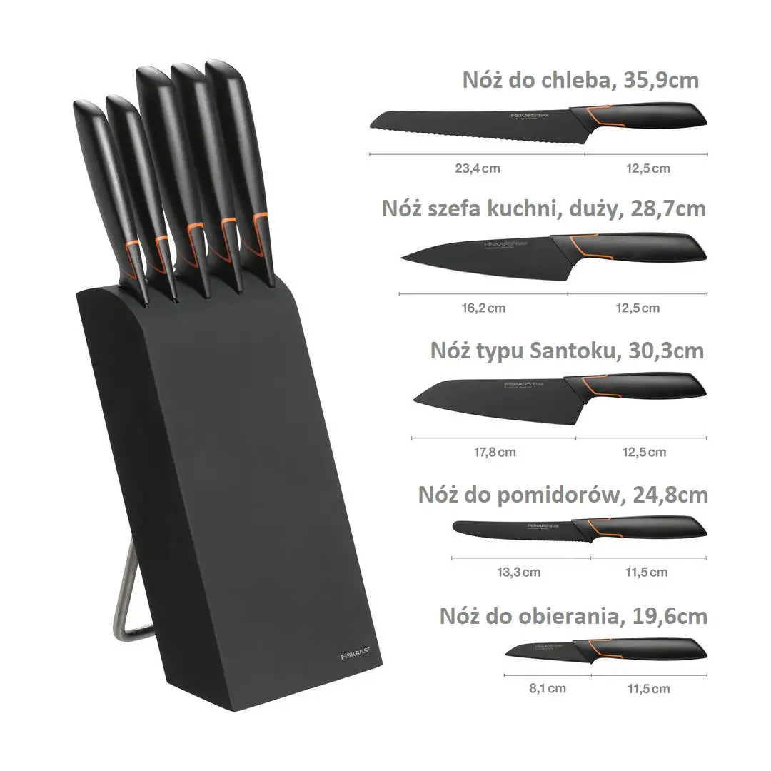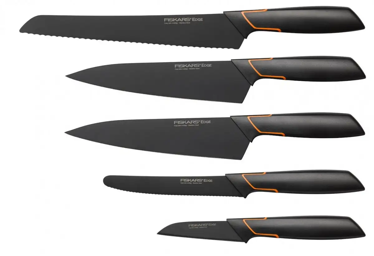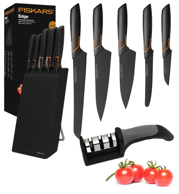 FISKARS EDGE 1003099 Zestaw 5 noży kuchennych w bloku czarnym / stal 420J2 / czarne ostrza + OSTRZAŁKA Koopman
