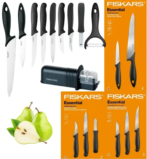 FISKARS ESSENTIAL Komplet 8 noży (kuchenne +do warzyw +do obierania) w pudełku + Ostrzałka + Skrobaczka ESSENTIAL