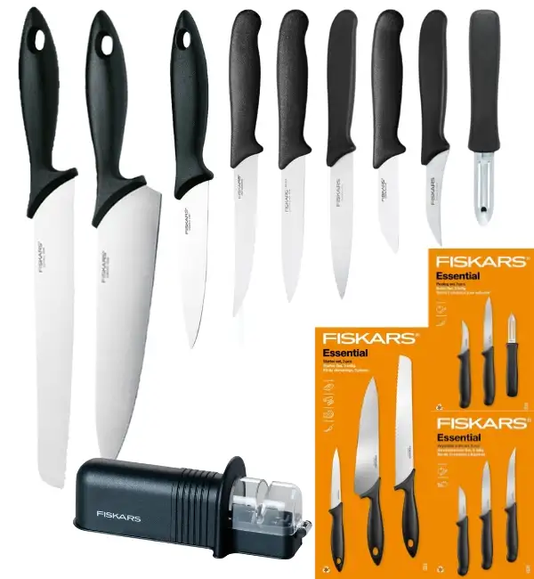 FISKARS ESSENTIAL Zestaw 9 noży (kuchenne +do warzyw +do obierania) w pudełku / stal nierdzewna HRC 53 + Ostrzałka ESSENTIAL