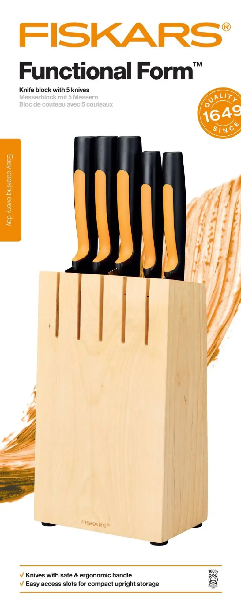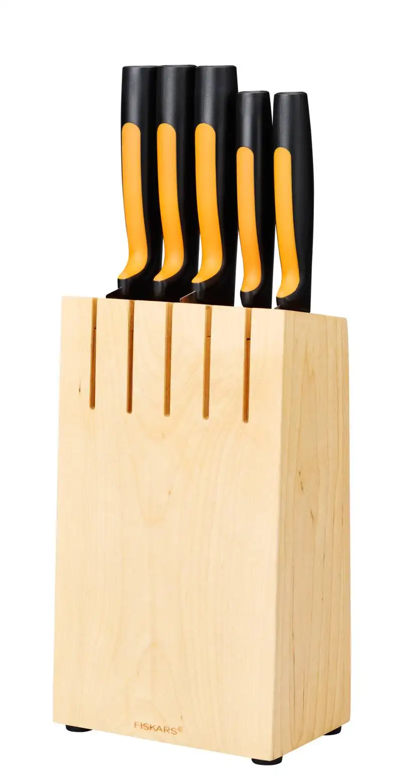 FISKARS FUNCTIONAL FORM Komplet 5 noży w bloku drewnianym + Ostrzałka Functional Form