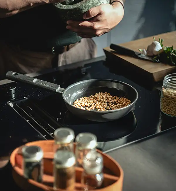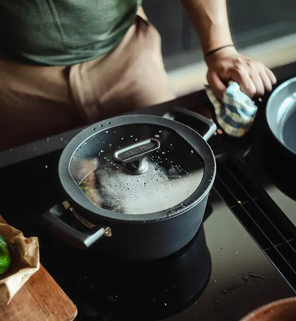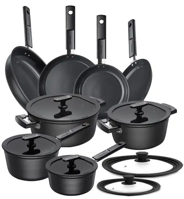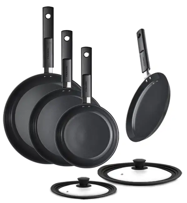 FISKARS HARD FACE Komplet garnki z pokrywkami 8 el + Patelnie 20, 24, 28 cm + pokrywki silikonowe TADAR + naleśnikowa / powłoka Ceratec™ Superior