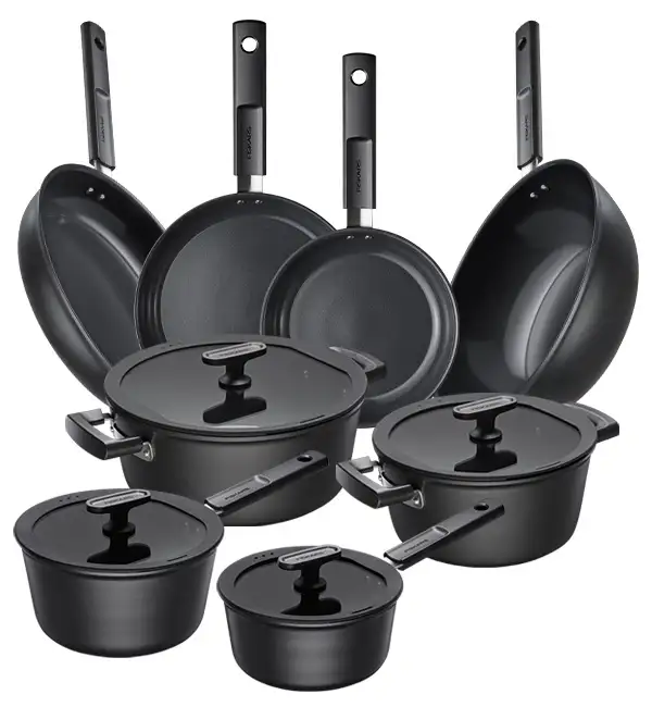 FISKARS HARD FACE Komplet garnki z pokrywkami 8 el + Patelnie 20, 24, 28 cm + Wok / powłoka Ceratec™ Superior