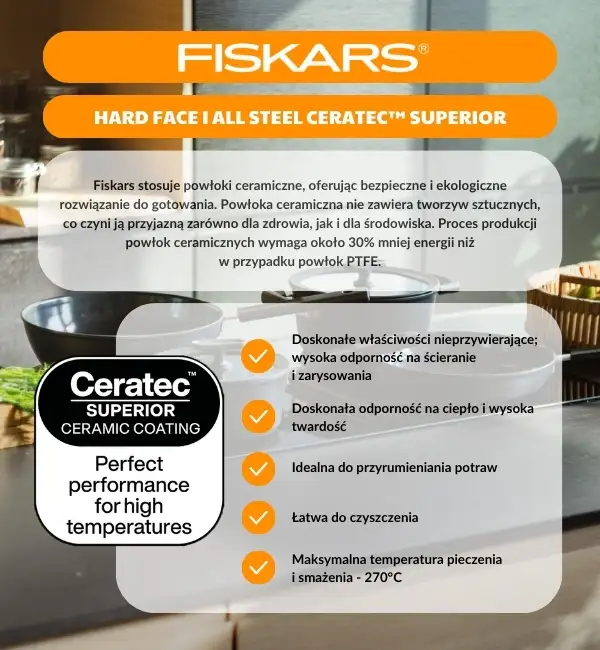 • Ceramiczna powłoka jest bezpieczna w użytkowaniu i niezwykle łatwa w czyszczeniu
