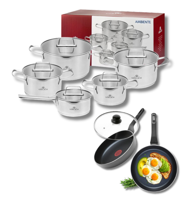 GERLACH AMBIENTE Komplet Garnki z pokrywkami 10 el + Patelnie Ambiente ThermoCoat 20, 28 cm + pokrywki szklane / stal nierdzewna / indukcja