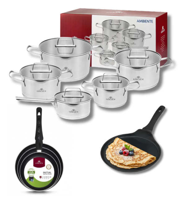 GERLACH AMBIENTE Komplet Garnki z pokrywkami 10 el + Patelnie Initial 20, 24, 28 cm + patelnia naleśnikowa 26 cm / stal nierdzewna / indukcja