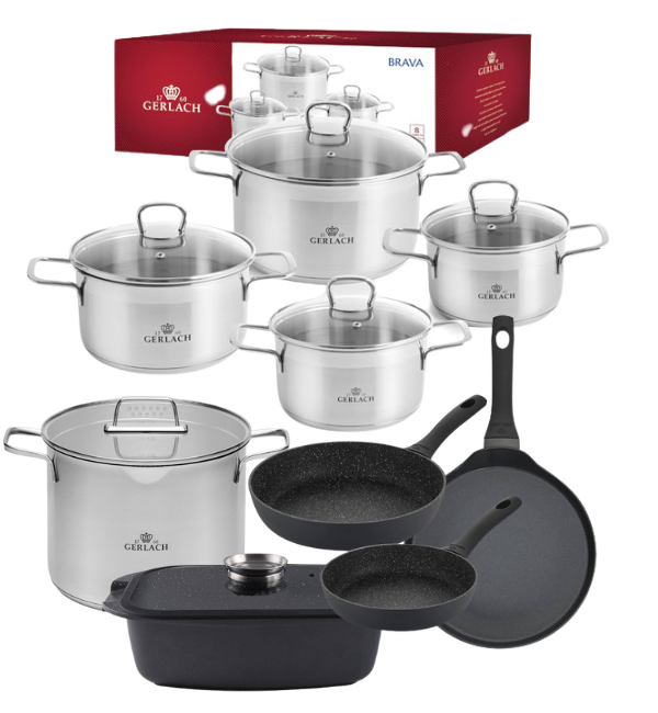 GERLACH BRAVA Komplet Garnki z pokrywkami 8 el + Patelnia naleśnikowa 26 cm Gerlach Harmony + Garnek Ambiente 7 l + Brytfanna Granitex 32 cm +Patelnie Granitex 20, 28 cm