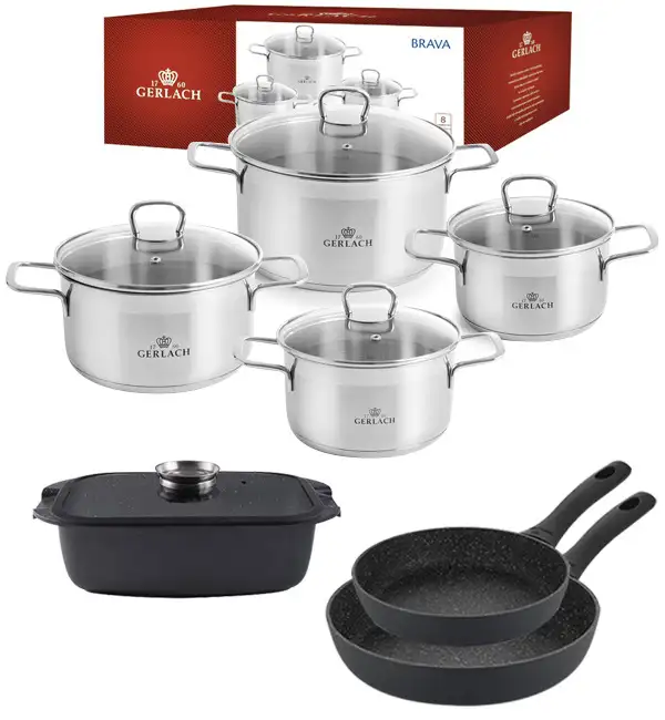 GERLACH BRAVA Komplet Garnki z pokrywkami 8 el + patelnie Gerlach Granitex 24, 28 cm + Brytfanna Granitex 32 cm