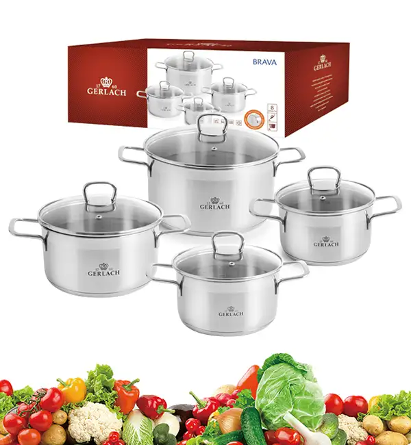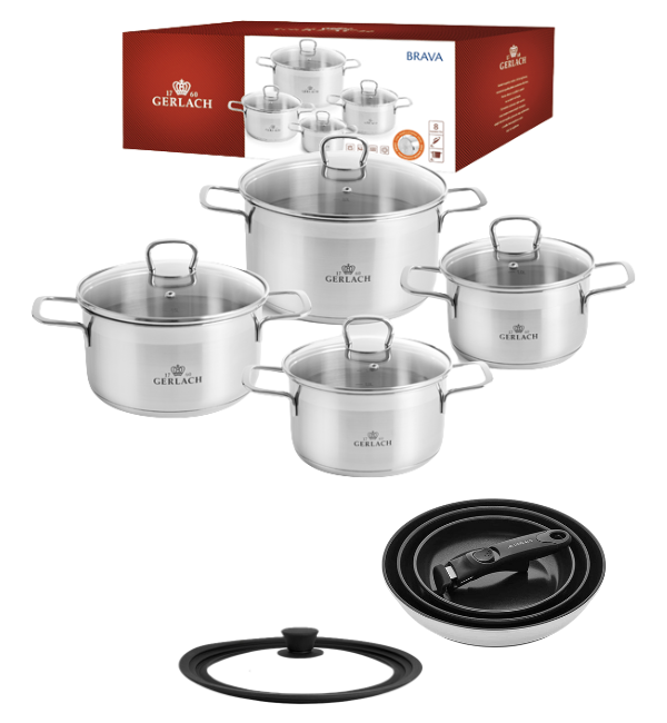 GERLACH BRAVA Komplet Garnki z pokrywkami 8 el / Stal nierdzewna / INDUKCJA + Patelnie Smart Steel 20, 24, 28 cm + pokrywka silikonowa 24/26/28 cm