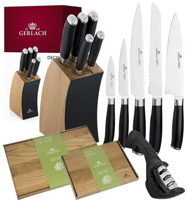 GERLACH DECO BLACK Komplet 5 noży w bloku + ostrzałka 3w1+ komplet desek dębowych Natur