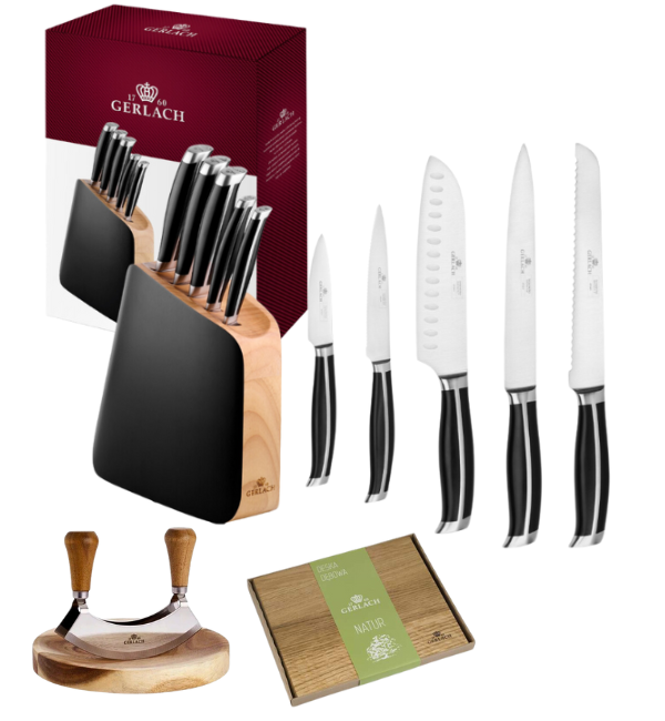 GERLACH LOFT Komplet 5 noży w bloku + Gerlach Natur Tasak do ziół + deska