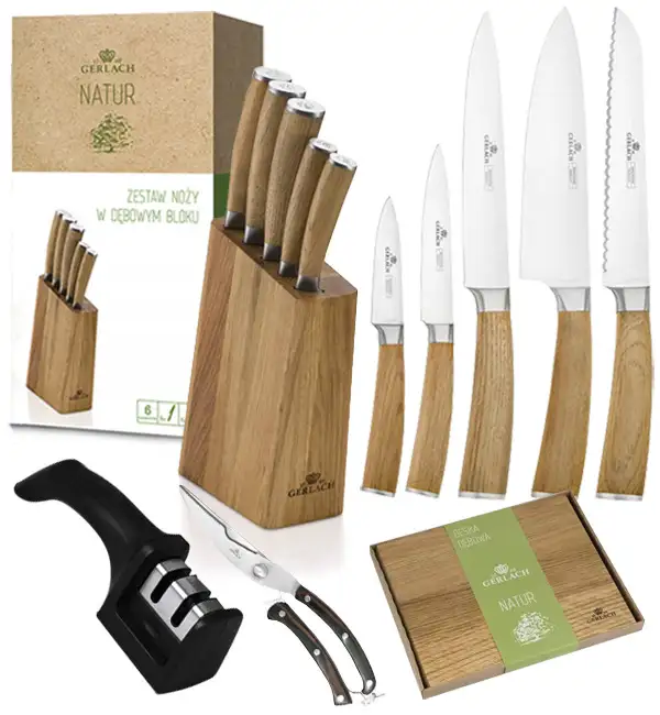 GERLACH NATUR Komplet 5 noży w bloku + ostrzałka 2w1 + nożyce do drobiu + deska