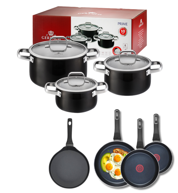 GERLACH PRIME Komplet Garnki z pokrywkami 6 el + patelnie Gerlach Ambiente 20, 24, 28 cm+ Patelnia naleśnikowa 26 cm