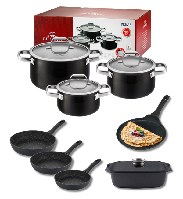 GERLACH PRIME Komplet Garnki z pokrywkami 6 el / stal nierdzewna + Patelnia naleśnikowa 26 cm + Patelnia Granitex 20, 24, 28 cm + Patelnia naleśnikowa + Brytfanna