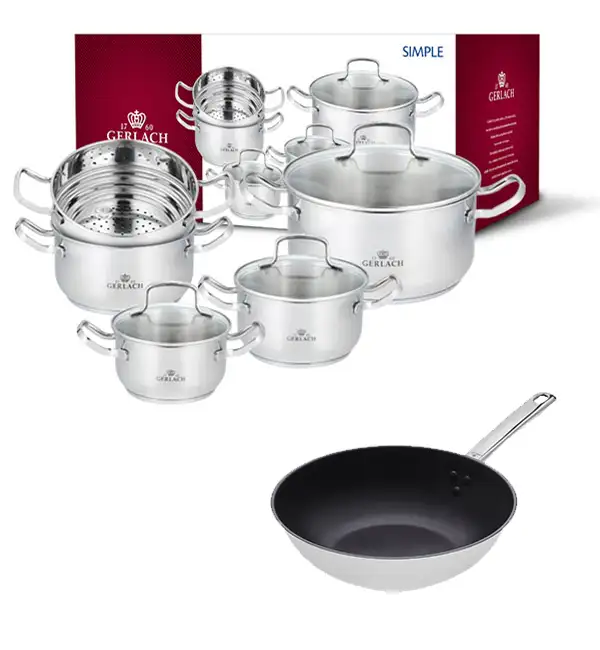 GERLACH SIMPLE Komplet Garnki z pokrywkami 9 el + Wok Gerlach Solid Lite 28 cm