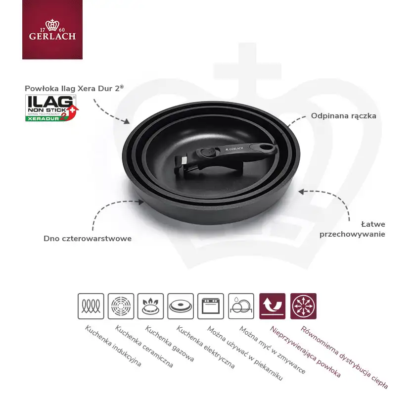 GERLACH SMART 994 Komplet 3 garnków 16/18/20 cm z odpinaną rączką + patelnie Smart 20, 24, 28 cm