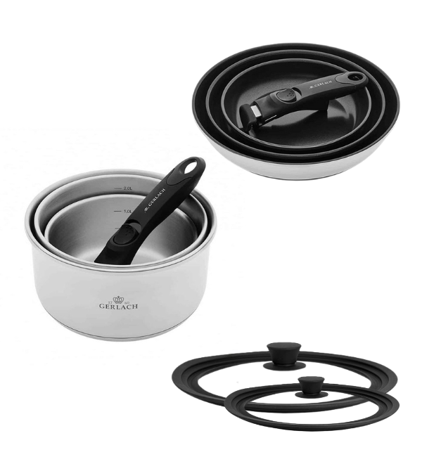 GERLACH SMART STEEL 996 Komplet 3 garnków 16/18/20 cm z odpinaną rączką + patelnie Smart Steel 20, 24, 28 cm + Pokrywki silikonowe M+D