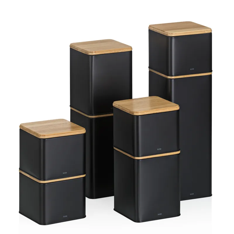 • Elegancki design - kontrastująca bambusowa pokrywka i czarny metalowy pojemnik dodają stylu każdej kuchni