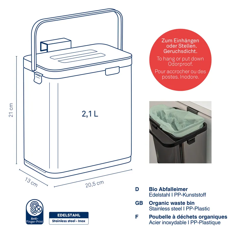 KELA | Plata | kosz na odpady organiczne, stal nierdzewna/tworzywo sztuczne, 2,1 l, 20,5 x 13 x 21 cm