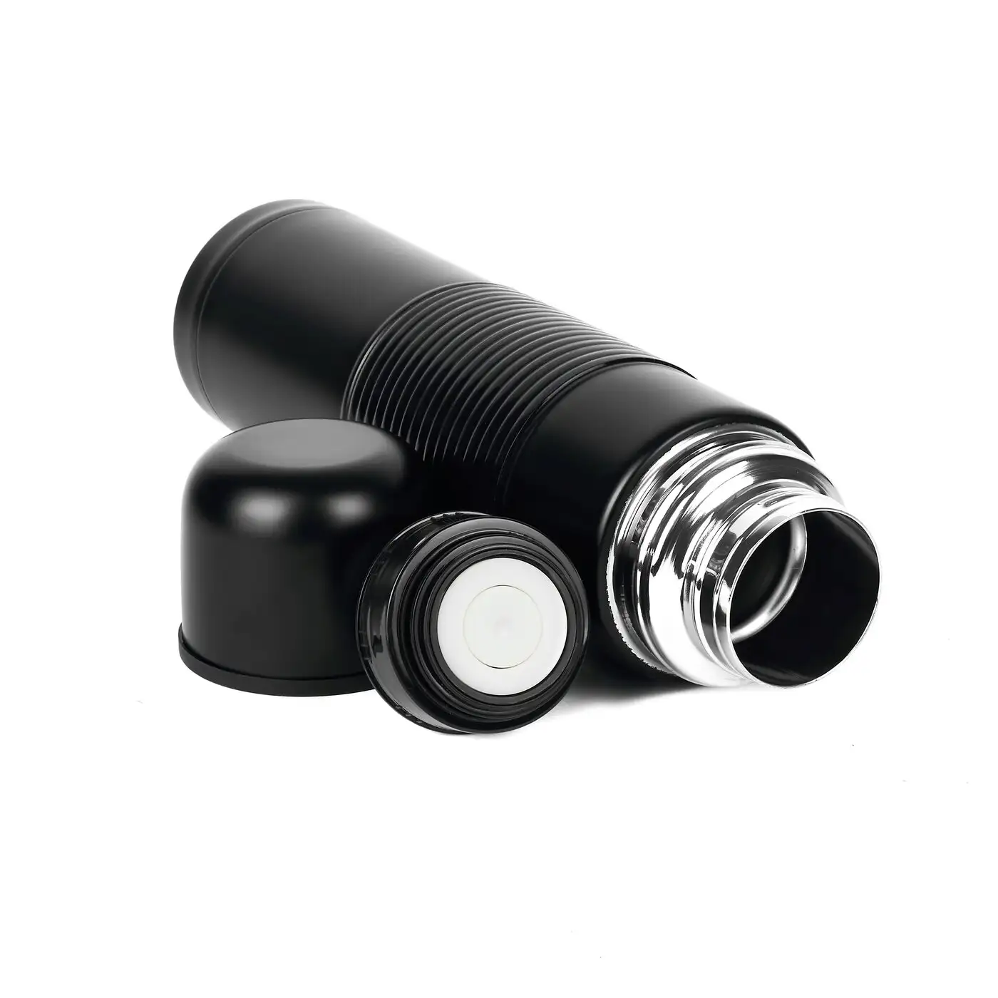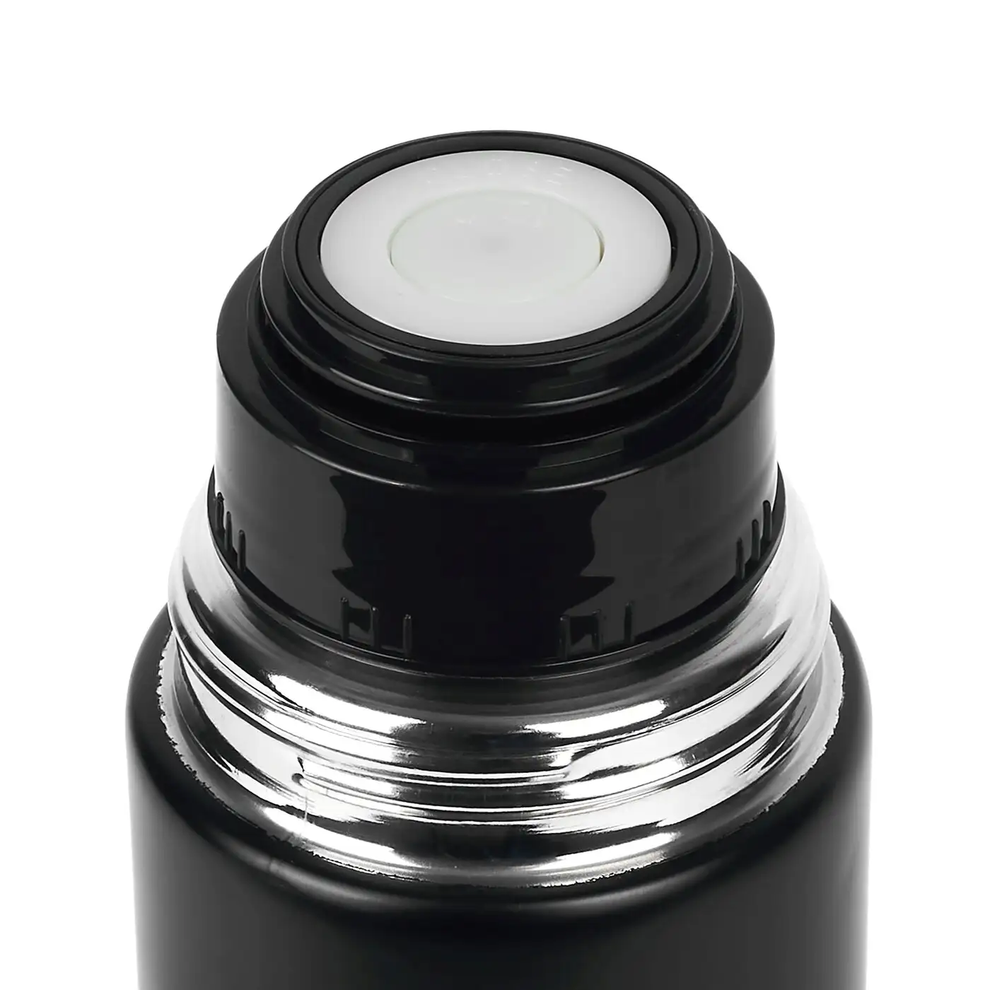 • Termos wykonany z wysokiej jakości stali nierdzewnej, malowany proszkowo w kolorze czarnym z antypoślizgową silikonową opaską