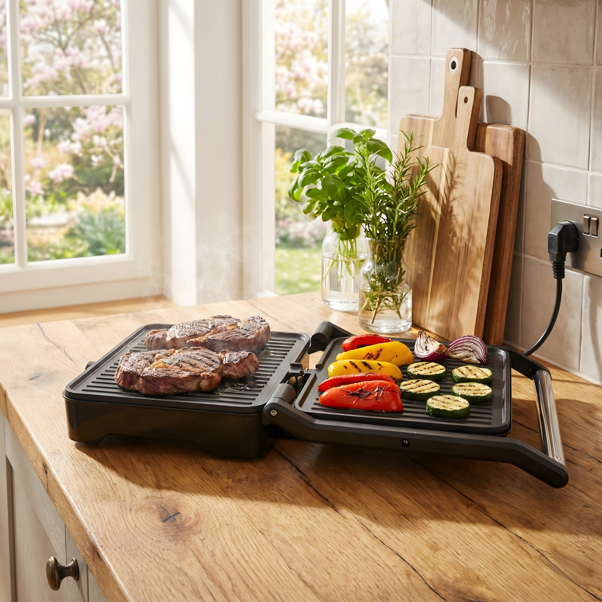 Możliwość rozłożenia do 180° – grill można otworzyć płasko, co zwiększa powierzchnię grillowania i umożliwia przygotowanie większych porcji