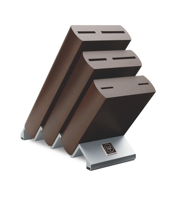 Przepięknie na kuchennym blacie prezentuje się kolejny „poskramiacz” ostrych narzędzi – blok kątowy na 6 noży. Przyrząd ten został opatrzony oryginalnym logiem producenta. Wykonany z drewna bukowego, ma niespotykany czekoladowy kolor. Zmieści sześć lub pięć noży kuchennych oraz stalkę ostrzącą. Polecamy.