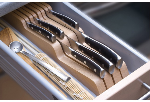 Wydaje się, że o nożach wiemy już wszystko. Bo cóż tu wiele dywagować. Nóż powinien być ostry, dobrze leżeć w dłoni i od czasu do czasu pozwolić się naostrzyć. O dobrych nożach, które można znaleźć w naszym sklepie napisałam jakiś czas temu w tekście pod tytułem Dobry nóż, to podstawa – z serii „Kuchenne gadżety”. Odsyłam do lektury. Mam nadzieję, że informacje tam zawarte będą pomocne przy wyborze tego narzędzia pracy. Tym razem nieco wiadomości na temat akcesoriów, które są nierozerwalnie związane właśnie z nożami. Często zdarza się, że mamy kilka sztuk tego ostrego narzędzia. Wędrują sobie niezorganizowane po szufladzie i o skaleczenie nietrudno, jeśli po nie sięgać. Może by uporządkować jakoś ten nożowy bałagan? Nic prostszego.