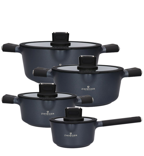 Z zewnątrz garnki pokryto czarnym, silikonowym lakierem żaroodpornym, natomiast dna naczyń zostały zrobione w technologii pełnej indukcji. Dzięki temu naczynia możemy stosować na wszystkich rodzajach kuchenek, także indukcyjnych. Uchwyty garnków Zwieger Obsidian posiadają silikonowe zabezpieczenia chroniące przed poparzeniem. Dołączone do naczyń pokrywki soft touch z silikonowym rantem i otworami odprowadzającymi nadmiar pary zapewniają szybsze i dużo bardziej efektywne gotowanie.