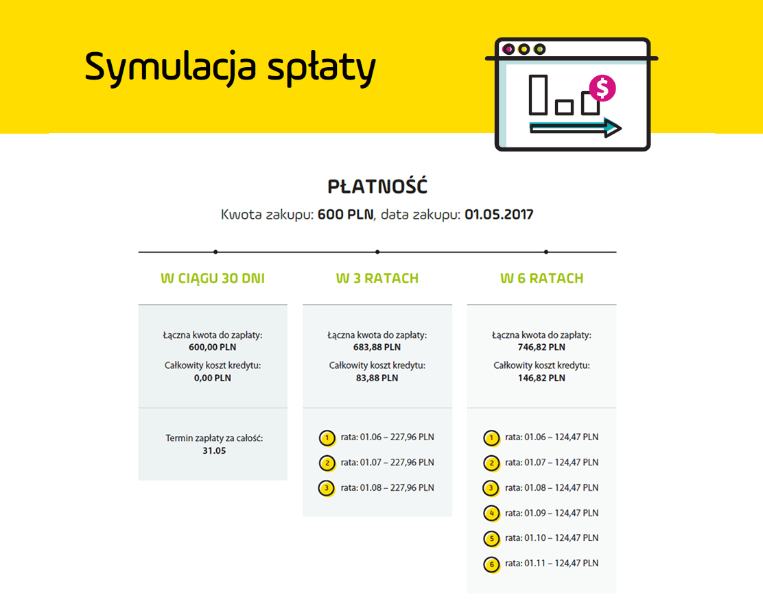 Po 30 dniach od zakupu spłata zostanie automatycznie rozłożona na 6 rat.