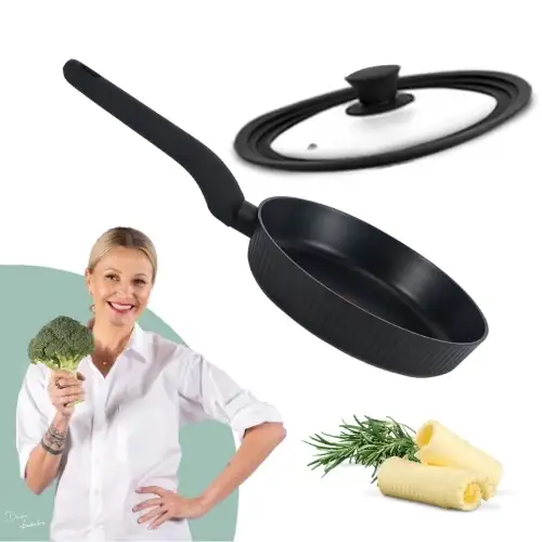 • W zestawie pokrywka uniwersalna z silikonowym rantem dopasowana aż do trzech rozmiarów patelni