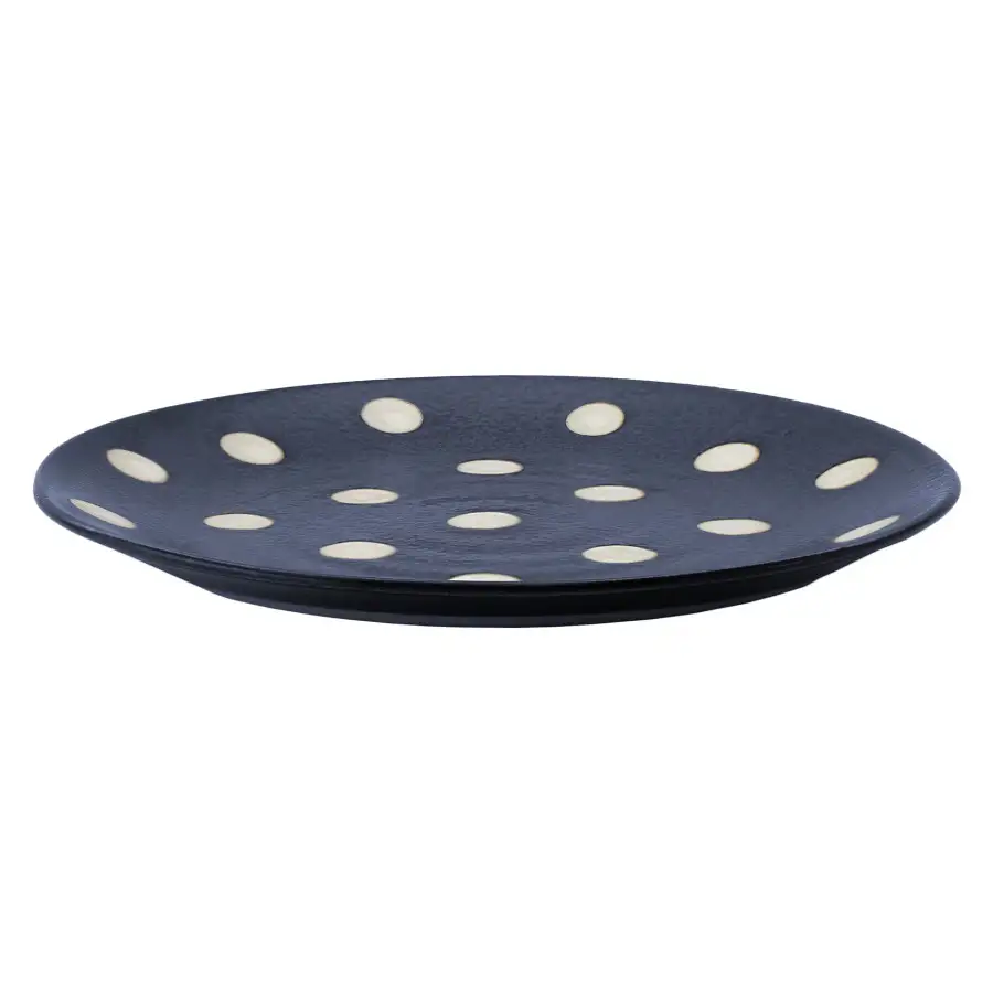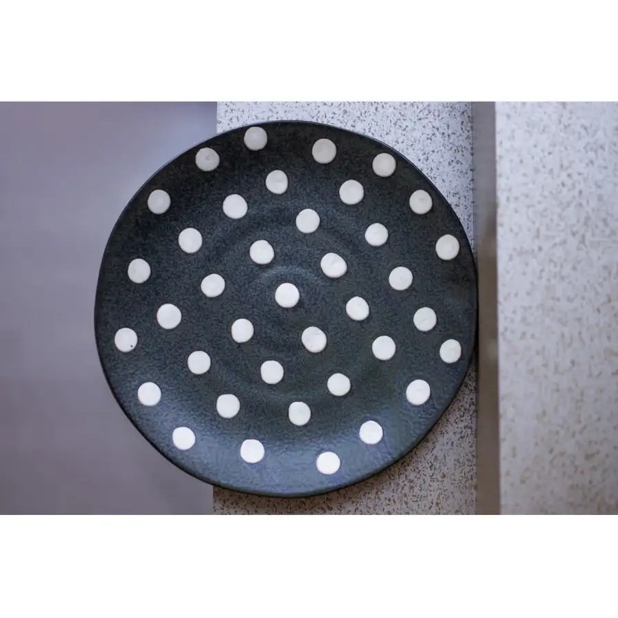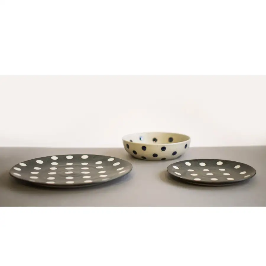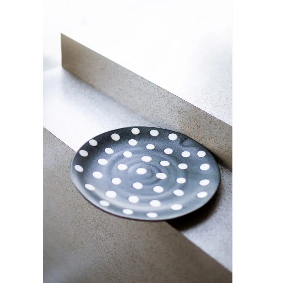 • matowe wykończenie porcelany, z wyjątkiem wybranych elementów (np. talerza głębokiego z granatowymi grochami o połyskującym szkliwieniu)