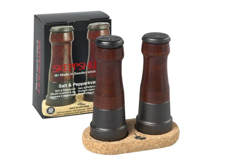 W kuchni prócz garnków, patelni, brytfann, używamy także innych produktów, równie potrzebnych, wręcz niezbędnych. Firma Skeppshult wychodząc naprzeciw oczekiwaniom klientów, wyprodukowała różne akcesoria, które pragniemy Państwu zaprezentować. Pierwszym z nich jest zestaw młynków do soli i pieprzu na korkowej podstawce. Doskonałe połączenie żeliwa, drewna i ceramiki. Z tej ostatniej wykonano mechanizm mielący. Dla wygody użytkowników nakrętki oznaczone są literkami „S” i „P”. Zestaw ten stanowi bardzo elegancki dodatek do każdej kuchni. Ważna informacja: korkowa podstawka gratis :)
