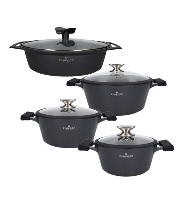 ZWIEGER BLACK STONE Zestaw garnków z pokrywkami 20, 24, 28 cm + Brytfanna 33 cm / GREBLON non-stick