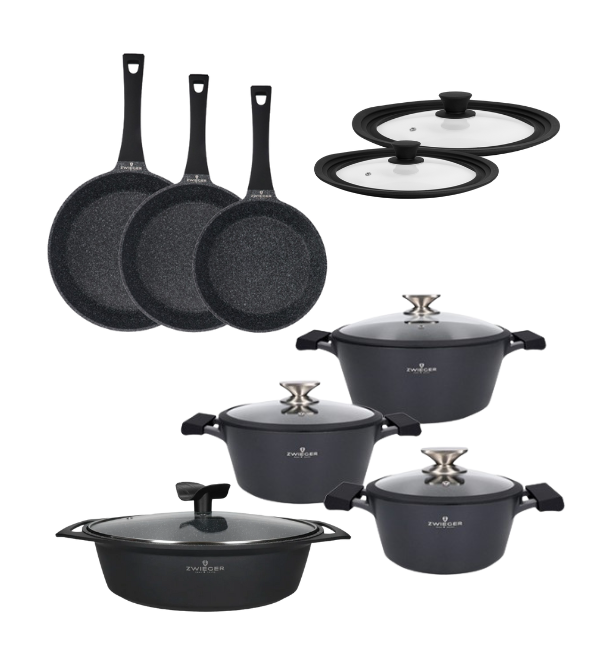 ZWIEGER BLACK STONE Zestaw garnków z pokrywkami 20, 24, 28 cm + Patelnie 20, 24, 28 cm + Brytfanna 33 cm + Pokrywki silikonowe TADAR