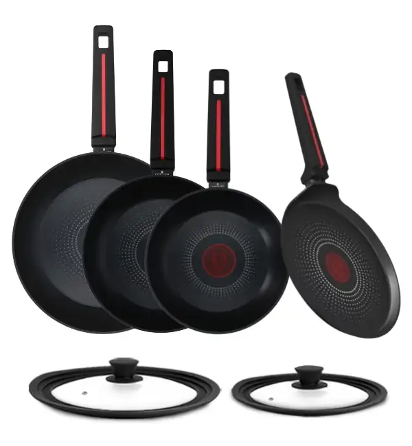 ZWIEGER RED LINE Komplet patelni 20, 24, 28 cm + Patelnia do naleśników 24 cm + Pokrywki silikonowe TADAR